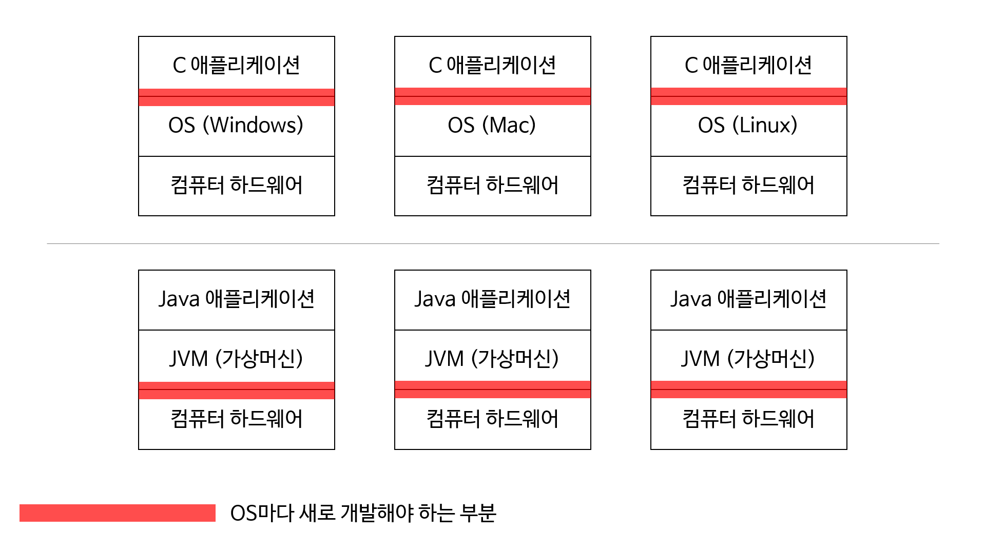하지만 문제는, 이 "기계어"라는 것은 운영체제마다 다르기 때문에 C언어와 같은 컴파일을 거치는 언어는 컴파일과정을 운영체제마다 다르게 해야한다는 단점이 있습니다. 즉, 윈도우용으로 컴파일된 프로그램을 맥이나 리눅스에서는 실행시키지 못합니다.