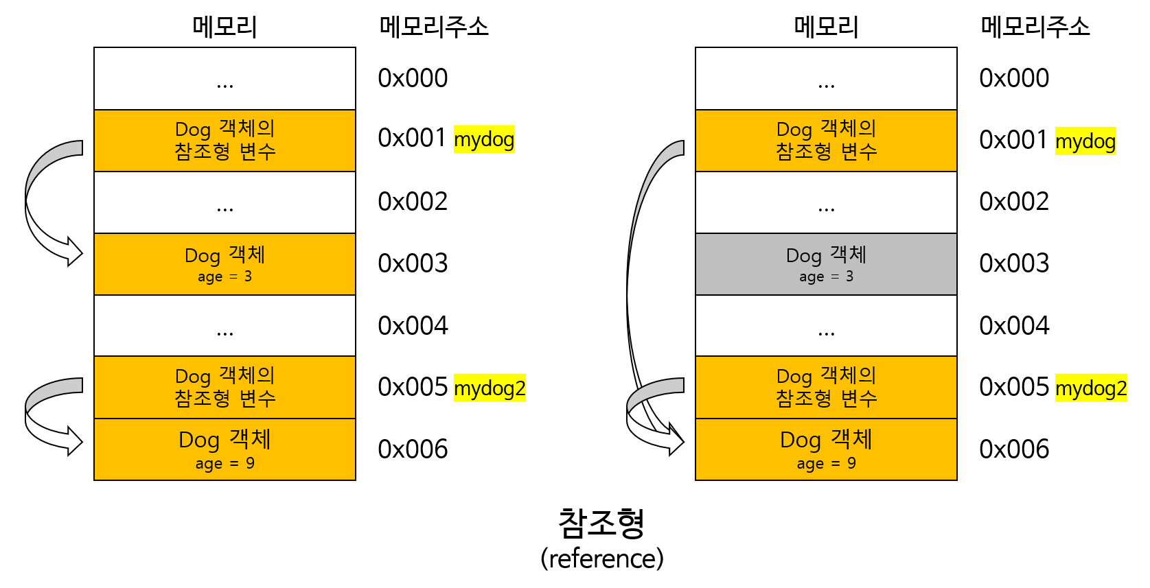 위 코드는 Dog 객체 두 개를 설정하고 나이를 설정한 뒤, myDog2가 가리키던(참조하던) 객체를 myDog도 참조하게 하는 코드입니다. 이러면 어떤 일이 일어날까요?