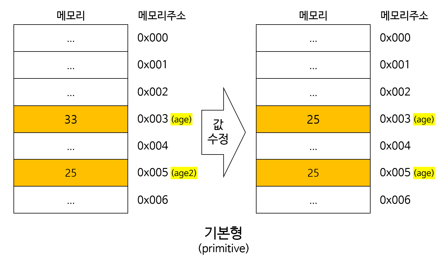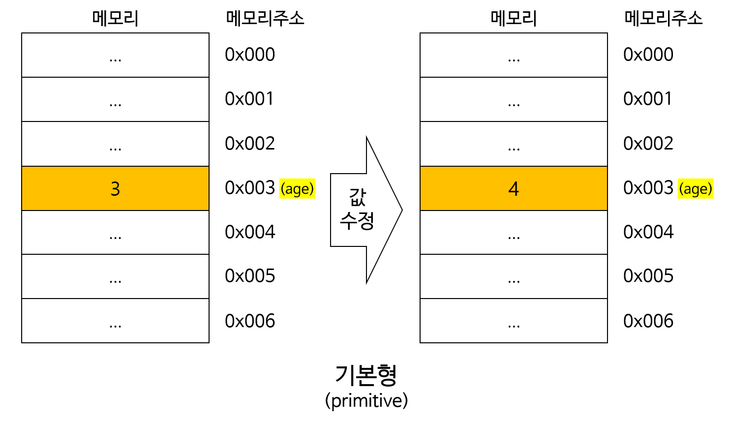 내부적으로는 기본형 변수가 저장된 메모리 주소에 새로이 값을 저장하게됩니다. 즉, age 변수에 저장된 값을 3에서 4로 바꾸죠.